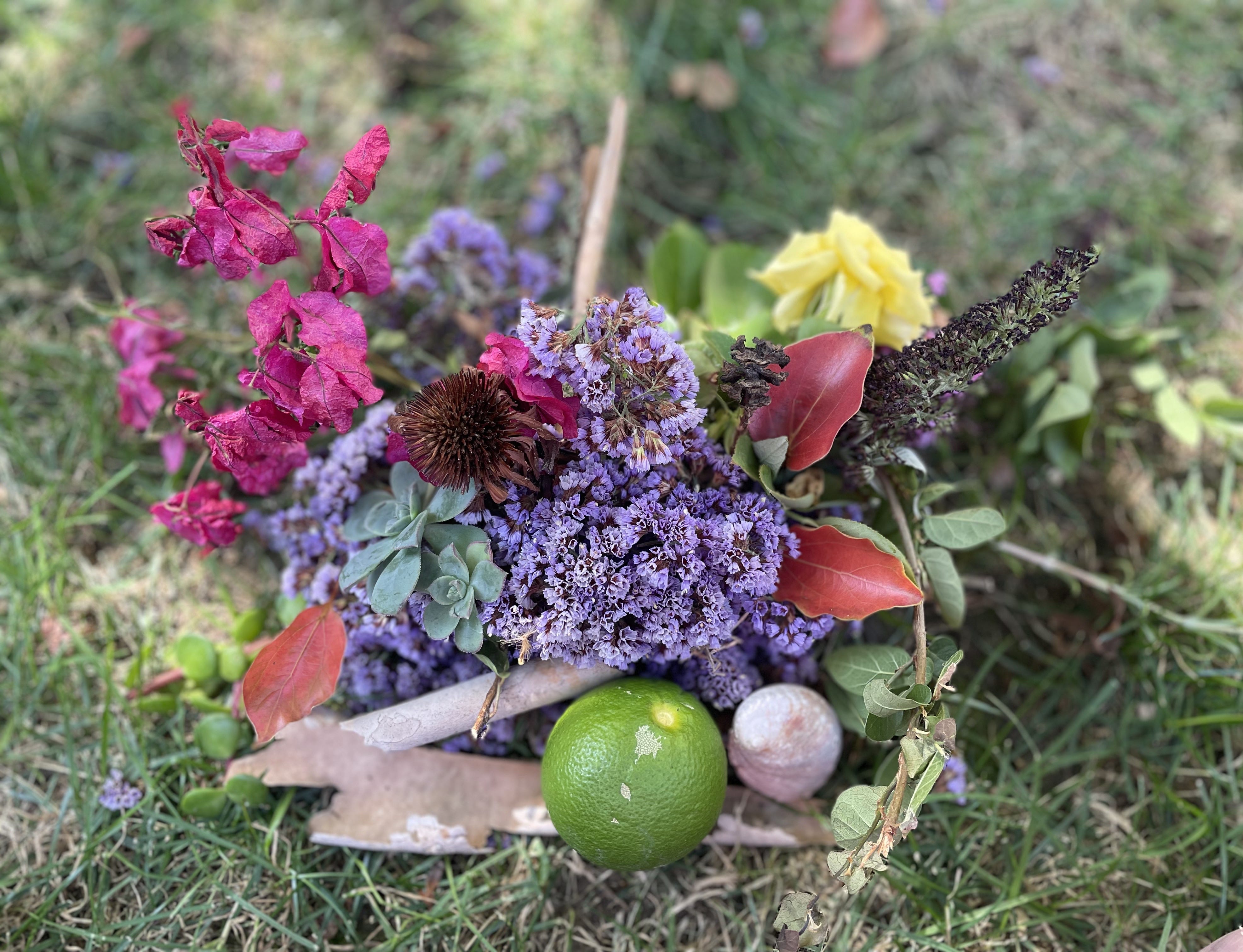Easy, peasy. With greedy enthusiasm, I reached for the snips of hot pink bougainvillea, plump succulents, and purple statice. The cones of my eyes danced with delight at the vibrant colors filling my palms. I wanted more, but I stepped back to allow others a chance to shop the pile. Once they made their selections, I went back in for a yellow rose, ripe lime, and more vibrant greens.