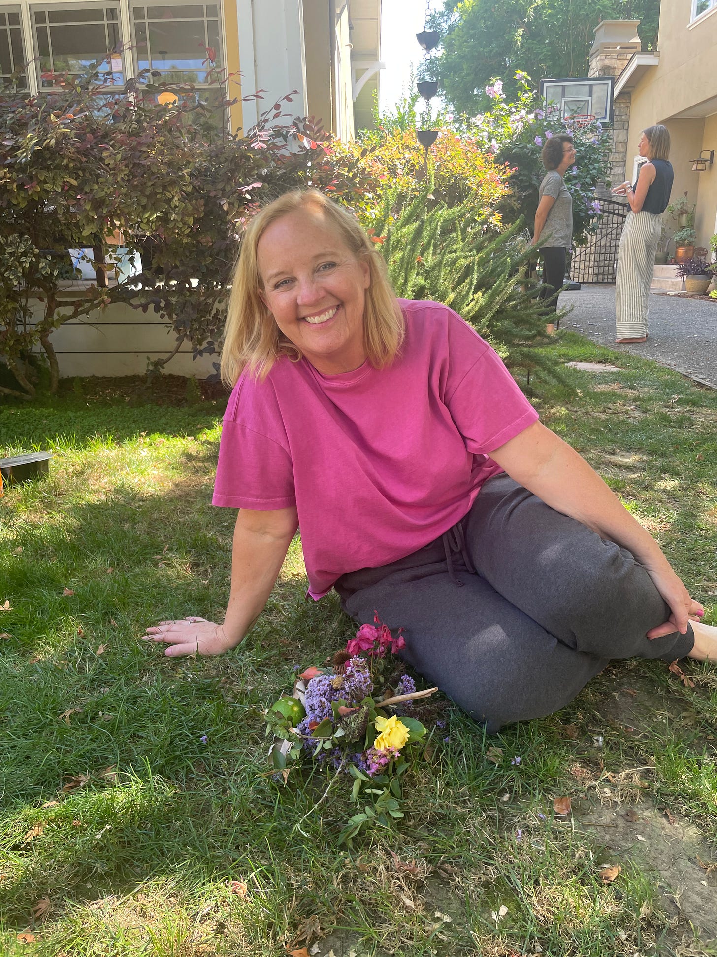 As we wind up our retreat, Julia, our co-facilitator, asks us to pose for a picture next to the morning altars we created. This will allow us a keepsake of our delight, as our designs made of flowers, twigs, fruit, and leaves stay in place to fertilize the ground beneath them.